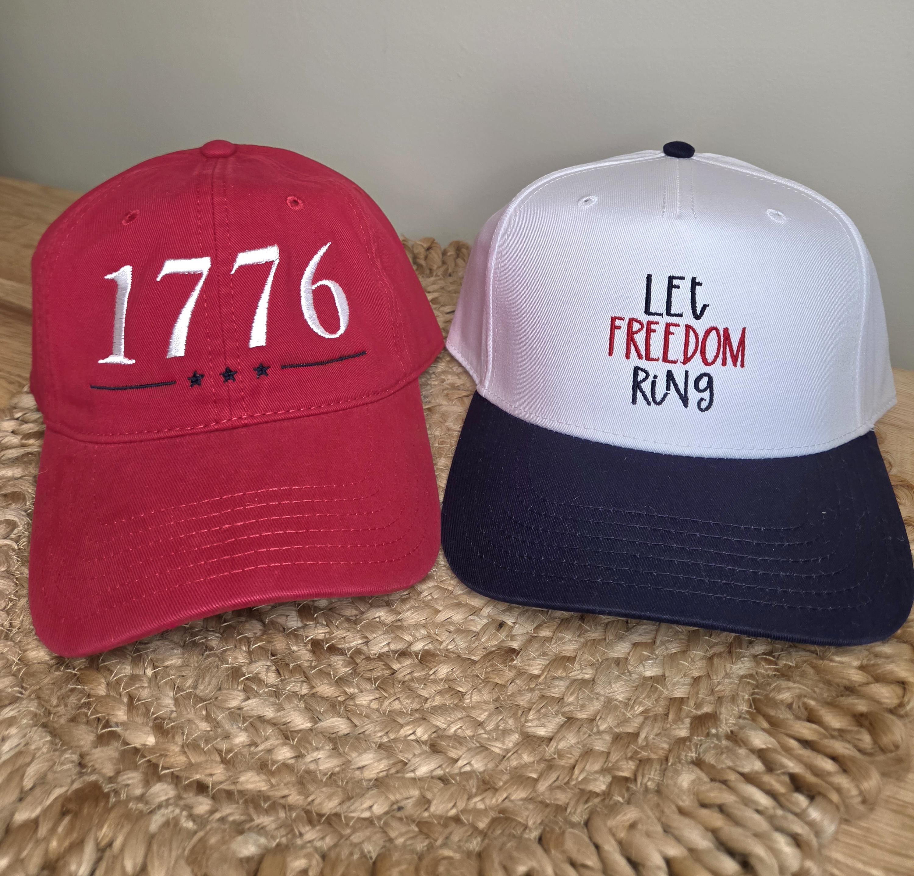 These embroidered patriotic hats feature bold, timeless designs like “1776” and “Let Freedom Ring” — perfect for celebrating freedom all year long, especially for the 4th of July, summer BBQs, parades, and everyday wear.