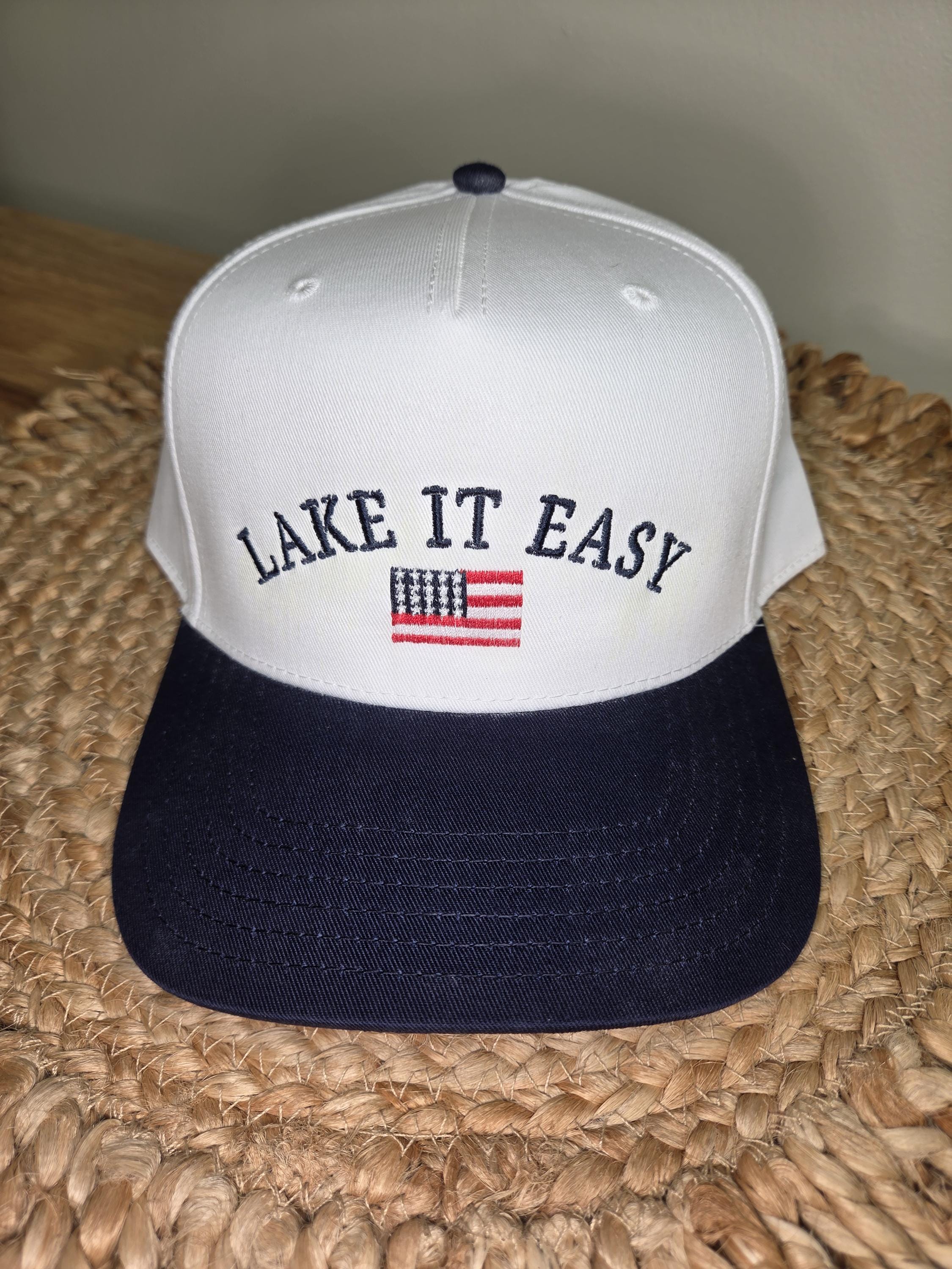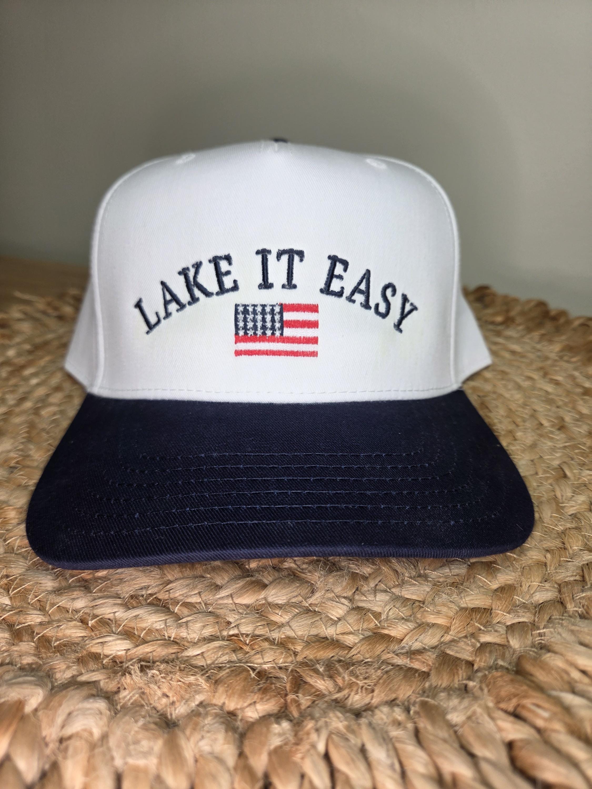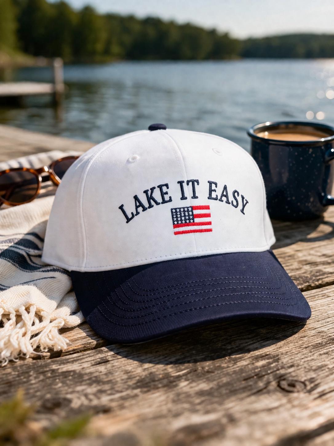 This embroidered baseball hat is the perfect blend of laid-back lake vibes and patriotic style. Featuring “Lake It Easy” stitched in red, white, and blue, this cap is made for sunny days on the water, boat rides, and backyard BBQs.