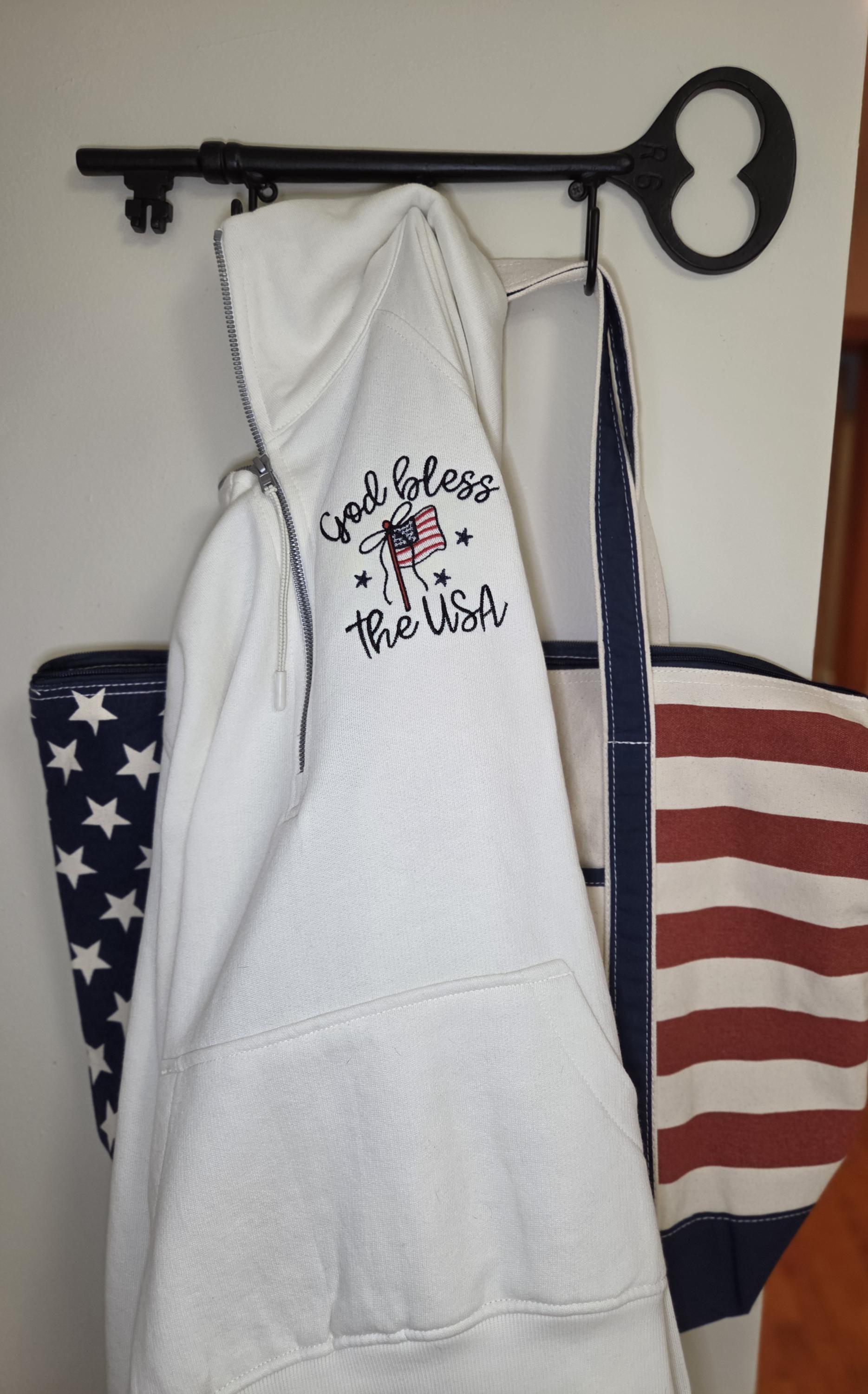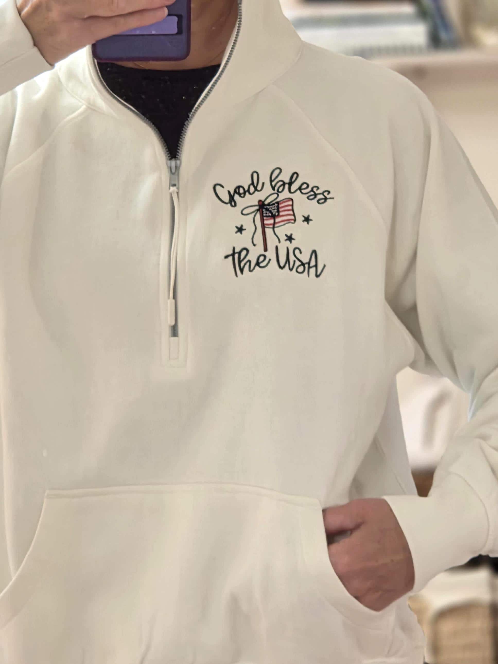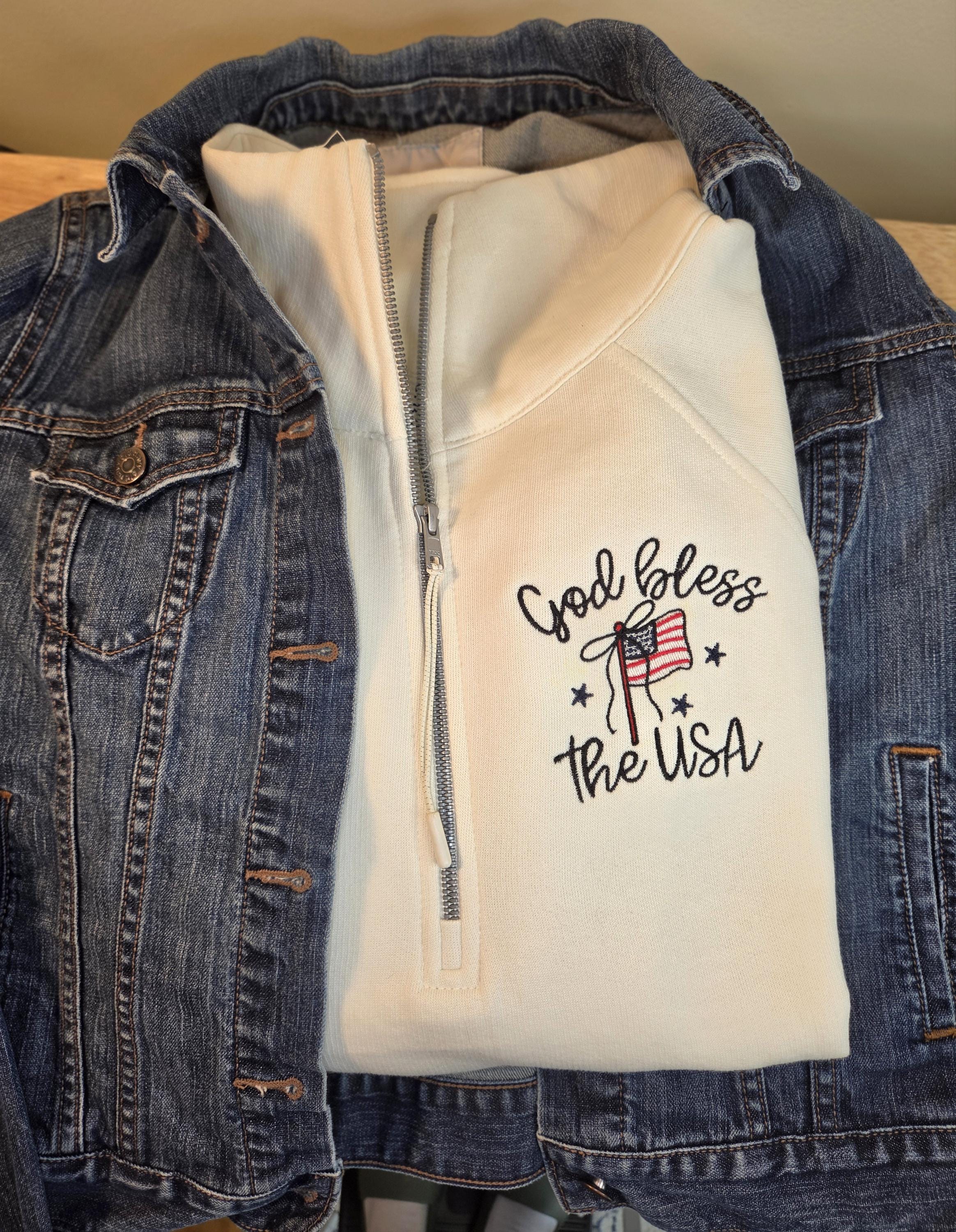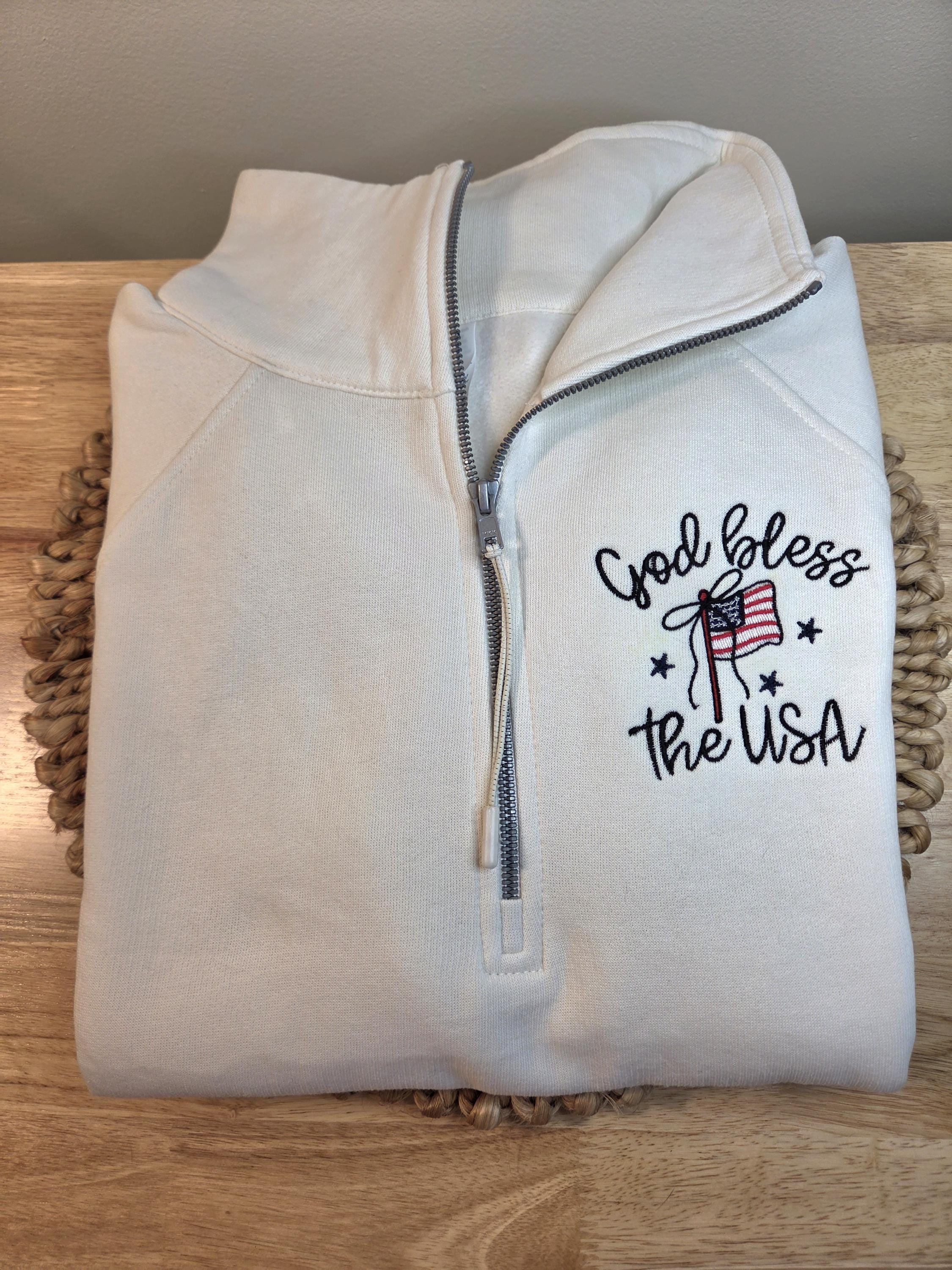 This “God Bless the USA” embroidered quarter zip sweatshirt is the perfect blend of cozy + classic patriotic vibes. Featuring high-quality embroidery, this piece is made to stand out while staying timeless — whether you're celebrating the 4th of July, heading to a summer BBQ, or just repping the USA year-round.